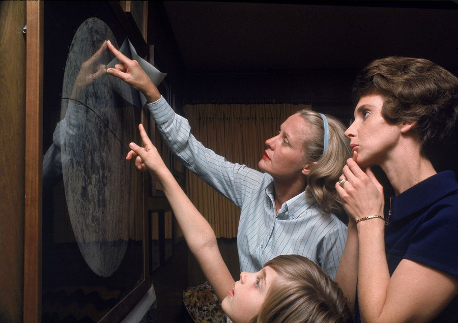 Read moreSue Borman (in light blue) and Gayle Anders (bottom) point at a poster of the moon while Gayle's mother, Valerie Anders, watches in Houston, Texas, in December 1968. The trio are tracking the route of the Apollo 8 mission piloted by the women's husbands, Frank Borman and William Anders. #
