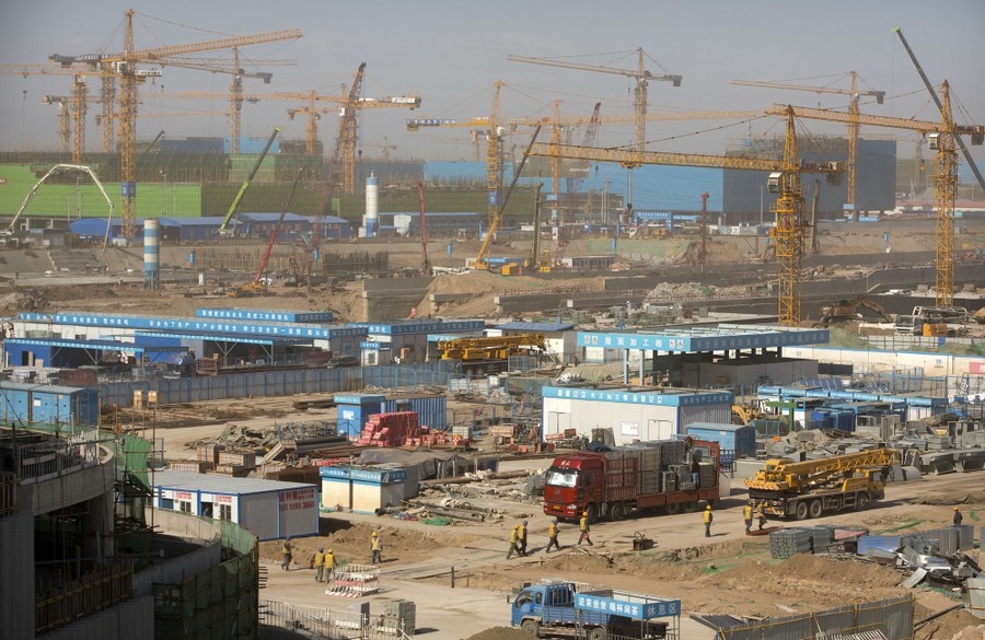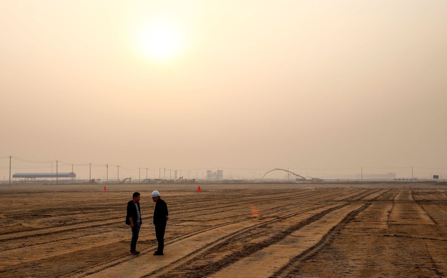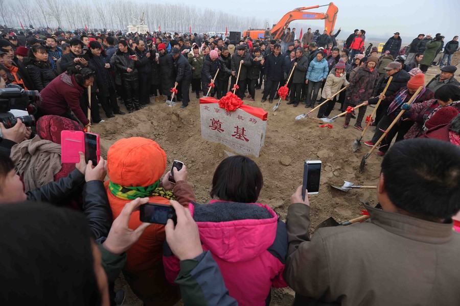 Read moreWorkers stand in the future landing-strip area at the construction site of the terminal for the new airport in Beijing's southern Daxing District on October 10, 2016. #
