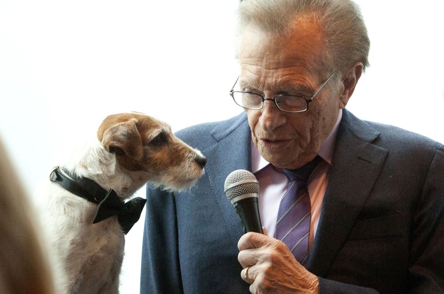 Read moreKing, a wire fox terrier, leans toward a microphone during a media availability at Sardi's in New York on February 13, 2019. King won Best in Show at the 143rd Westminster Kennel Club Dog Show the day before. #