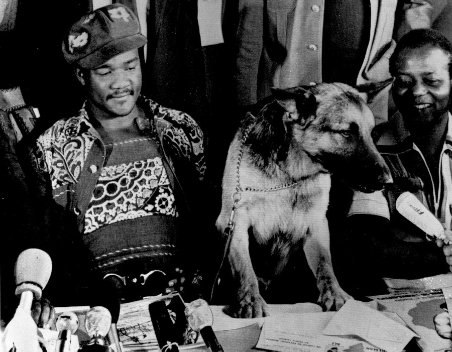 Read moreThe world heavyweight champion George Foreman listens as his shepherd dog, Daggo, barks into microphones during a news conference at Orly Airport in Paris on September, 12, 1974. Foreman was in transit from the United States to Kinshasa, the Democratic Republic of Congo, where was scheduled to meet Muhammad Ali in a title bout on September 24. #