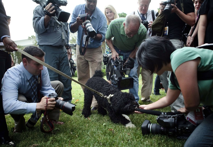 Read moreThe Obama family dog, Bo, is surrounded by members of the press in the Rose Garden of the White House during President Barack Obama's departure to Saudi Arabia for the first stop on a trip to the Middle East and Europe on June 2, 2009. #