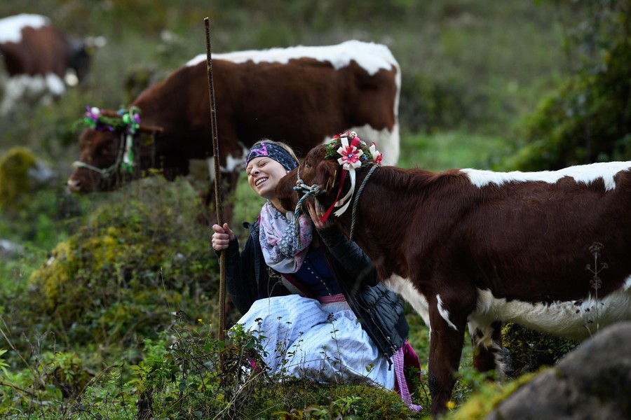 Read moreA young woman takes cows to a boat that takes them over the Koenigssee Lake during the annual ceremonial cattle drive, called an Almabtrieb, on October 6, 2018, at Schoenau am Koenigssee near Berchtesgaden, Germany. #