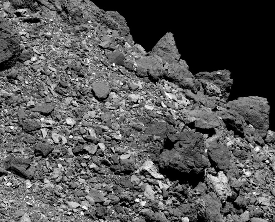 Read moreA closer image shows a region near Bennu's equator that contains many large boulders clustered loosely together by the asteroid's gravity, taken by the Polycam camera on NASA’s OSIRIS-REx spacecraft on April 4, 2019, from a distance of 4.6 kilometers (2.9 miles). For scale, the triangular boulder on the horizon is 9.2 meters (30 feet) high, which is almost as tall as the tail of a C-130 Hercules aircraft. #
