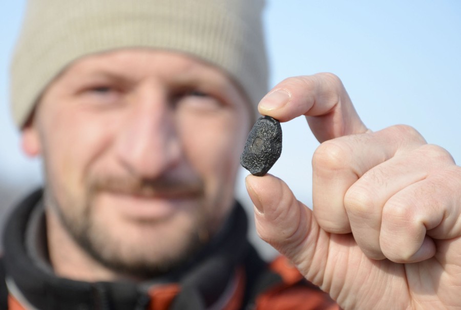 Read moreA local resident shows a fragment thought to be part of a meteorite collected in a snow-covered field in the Yetkulski region outside the Ural city of Chelyabinsk on February 24, 2013. A meteor that exploded over Russia's Ural Mountains and sent fireballs blazing to Earth set off a rush to find fragments of the space rock, which hunters hoped could fetch thousands of dollars apiece. #
