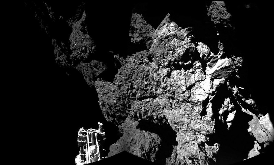 Read moreThe Philae lander of the European Space Agency's Rosetta mission landed safely on the surface of the comet 67P/Churyumov-Gerasimenko, as these first two images from the lander's CIVA camera confirm. One of the lander's three feet can be seen in the foreground. The view is a two-image mosaic taken on November 12, 2014. Rosetta and Philae had been riding through space together for more than 10 years. Philae was the first probe to achieve a soft landing on a comet, and Rosetta was the first to rendezvous with a comet and follow it around the sun. #