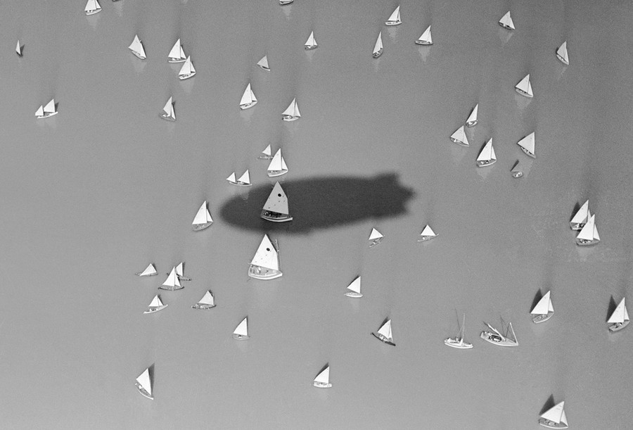 Read moreOriginal caption: "A blimp casts its shadow over the the water as sailing craft follow the course in the President's Cup Regatta off Hains Point." Photo taken circa 1940, off Hains Point in southwest Washington, D.C. #
