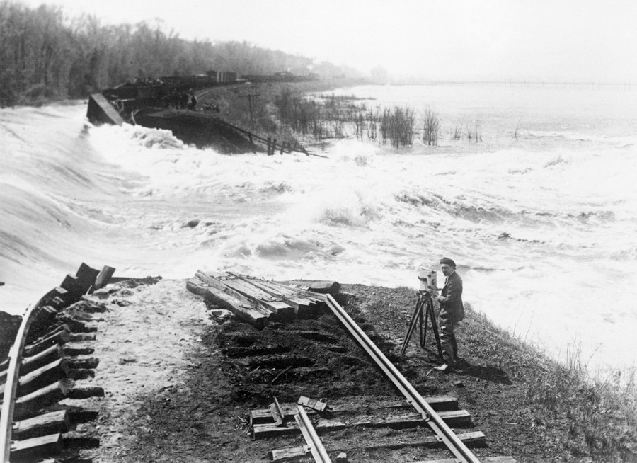 Read moreOriginal caption: "Thirty feet of water raging towards Beardstown, Illinois, as the levee broke under the tremendous pressure. The Illinois River at flood stage, the highest ever known, rapidly poured in the lowlands at the right. In foreground are the C.B. & Q. railroad tracks. The last connecting link between Beardstown and the outside world, just washed away." Photo was taken on April 18, 1922, by Norman W. Alley of International Newsreel Staff. #