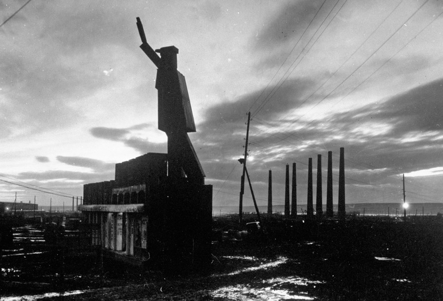 Read moreSilhouetted at twilight, a gigantic sculptured rendition of a Russian robot with its hand raised in a salute, in Magnitogorsk, Chelyabinsk Oblast, Russia, circa 1931 #