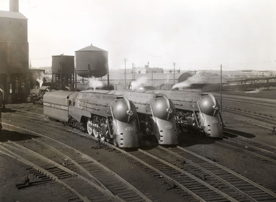 Read moreOriginal caption, from 1939: "New York—New York Central Railroad Yard. Photo shows three 'Hudson' (4-6-4)-type locomotives, streamlined for the 'Twentieth Century Limited' service." #