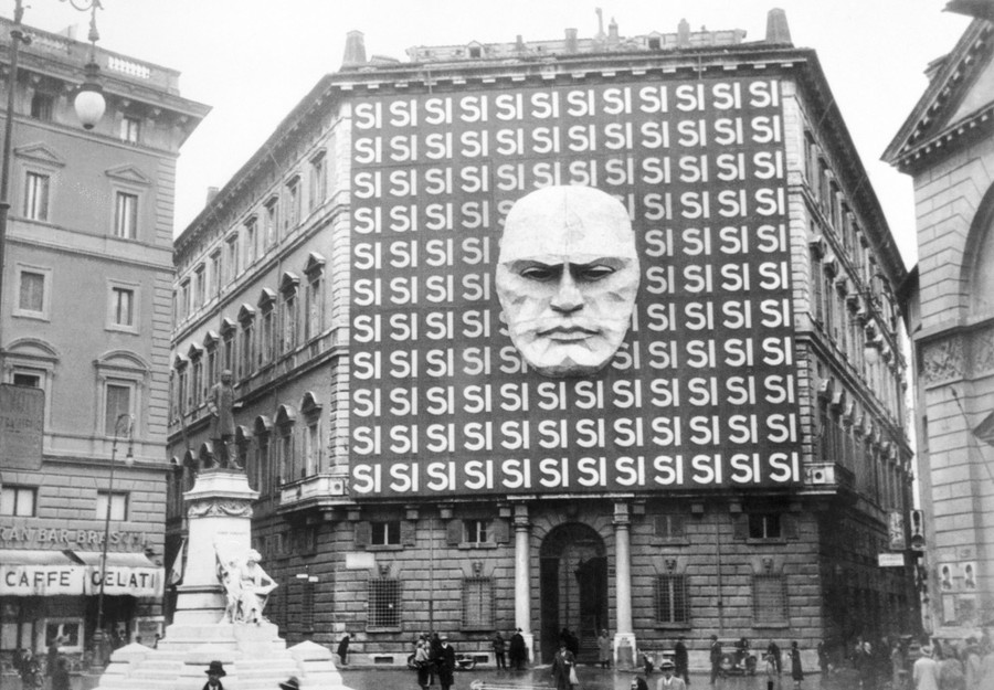 Read moreOriginal caption, from April 4, 1934: "The word Si, or yes, fills every bit of this large election billboard, except for the space taken by a huge modernistic conception of Premier Benito Mussolini. The great placard covers the front of the Palazzo Braschi, the most modern of Rome's office buildings and home of the Fascist Party's offices." #