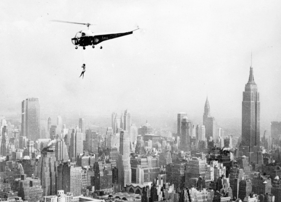 Read moreMaryln Rich, suspended by a helicopter over the skyscrapers of Manhattan, performs stunts on behalf of the American Relief for Korea organization, on August 27, 1951. #