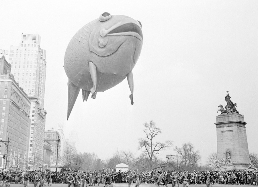 Read moreOriginal caption: "Some of the creatures who make their way down Broadway in the annual Macy's Thanksgiving Parade are enough to faze even a taxi driver. Here, throngs of New Yorkers jamming Columbus Circle gape as a flying fish swings onto Broadway from Central Park West." #