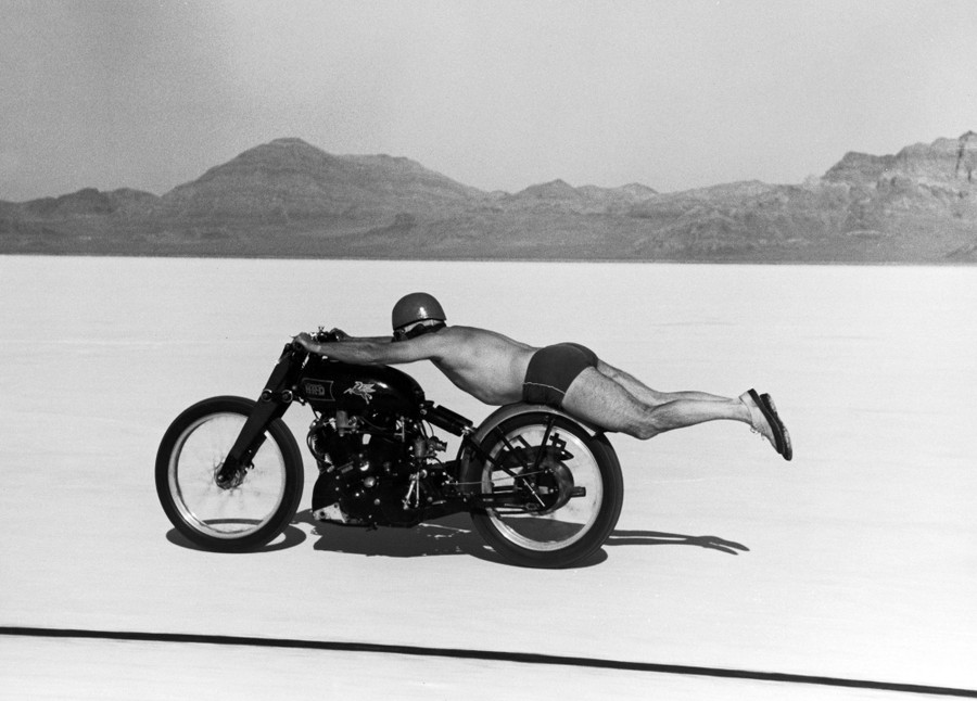 Read moreThe motorcycle racer Roland Free lies horizontally on his bike (to reduce wind resistance) as he breaks the world speed record on Utah's Bonneville Salt Flats on September 13, 1948. #