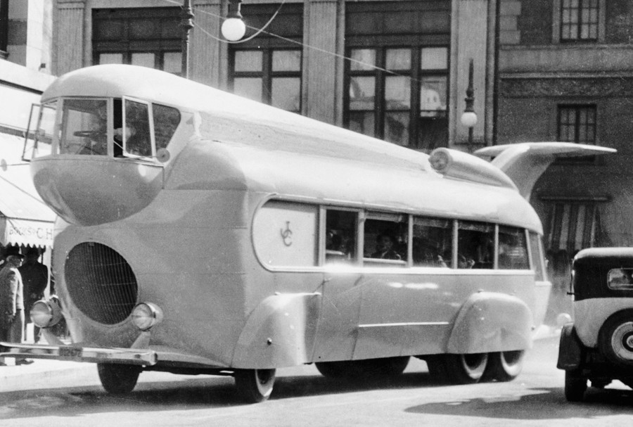 Read moreThe Jack Conrad Band bus, built for and featured in the 1935 film Stolen Harmony. The streamlined 36-passenger vehicle was driven by a pilot in the "crow's nest" jutting out over the front bumper, and featured a mighty tail fin above its rear observation deck. #