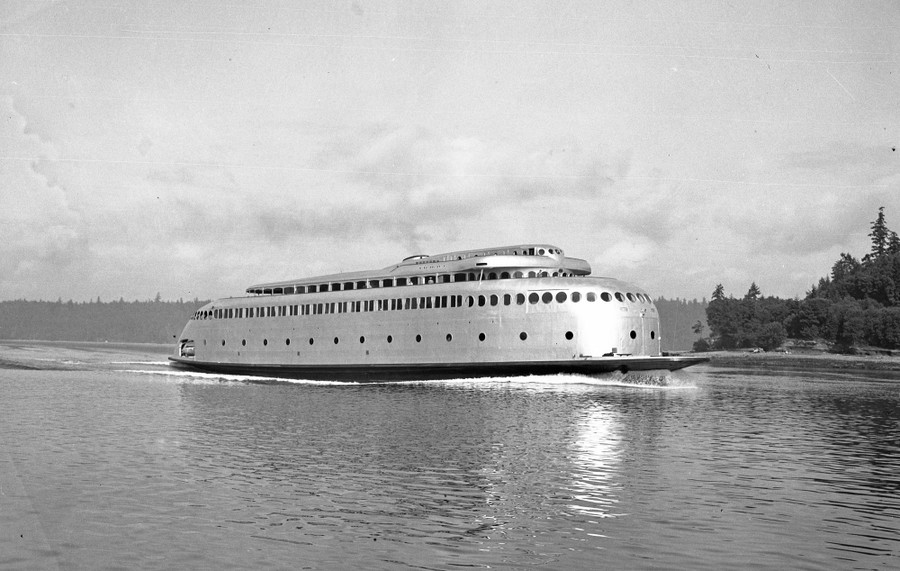 Read moreThe MV Kalakala ferry operates in Rich Passage in Puget Sound, circa 1940. The Kalakala operated in Puget Sound from 1935 to 1967, then was retired and sold to a fish-processing company in Alaska. After decades of use as a cannery structure, the Kalakala was purchased by an individual in the 1990s and towed back to Seattle, with the intent to be restored as a museum or a working vessel. Years of missed deadlines and financial difficulties followed, and the deteriorating ferry changed hands multiple times, eventually being scrapped in 2015. #
