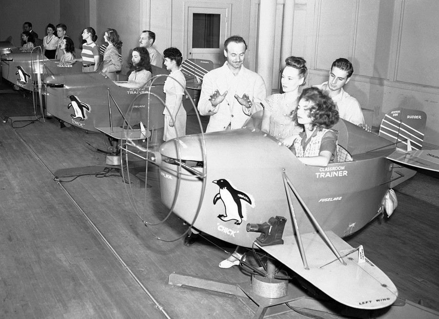 Read moreAlbert H. Luke (center), an instructor at the Sheil School, advises a student as she operates the controls of a preflight trainer called the "penguin" in Chicago, Illinois, on July 25, 1945. The penguin gives flight students the basic "feel" of flying without leaving the ground. #