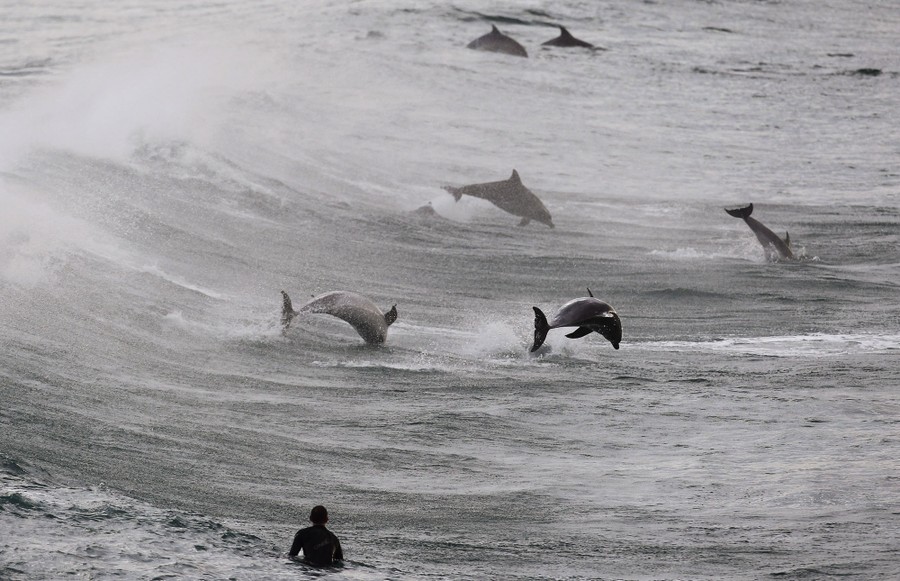 Read moreSurfers look on as dolphins fly through the air off Tamarama Beach in Sydney, Australia, on July 9, 2019. Bottlenose dolphins are commonly seen all along the NSW coastline. #