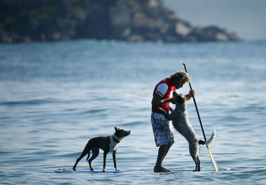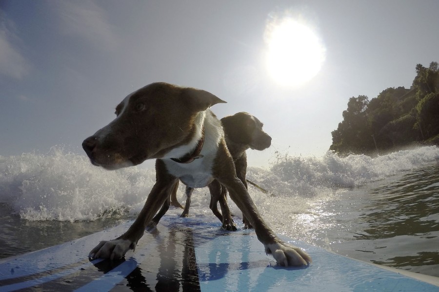 Read moreThe rescued dogs Rama (front) and Millie ride a wave with their owner, the Australian dog trainer and former surfing champion Chris de Aboitiz (obscured), off Sydney's Palm Beach, on February 18, 2016. #