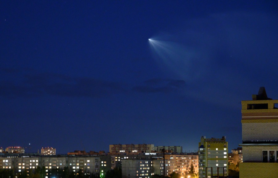 Read moreA ground-based view from about the same time as the above photo shows the exhaust plume of the Soyuz spacecraft as seen from the Siberian city of Omsk, Russia, on September 25, 2019. #