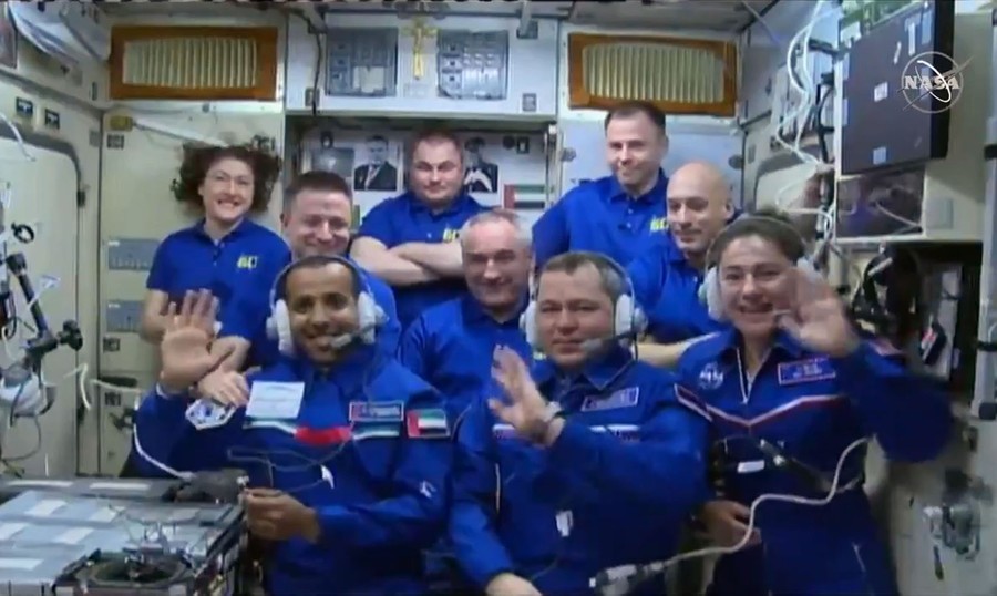 Read moreAfter a successful docking, the new ISS crew members board, bringing the number of astronauts aboard the space station to nine. Back row, from left: Christina Koch, Alexey Ovchinin, and Nick Hague; Middle row: Andrew Morgan, Aleksandr Skvortsov, and Luca Parmitano; Front row: Hazzaa Ali Almansoori, Oleg Skripochka, and Jessica Meir. #