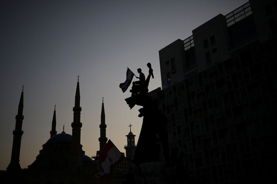 Read moreA demonstrator holds a Lebanese national flag as he sits atop a statue in Martyr's Square, with the Al-Amin mosque in the background, during an anti-government protest in Beirut on October 22, 2019. #