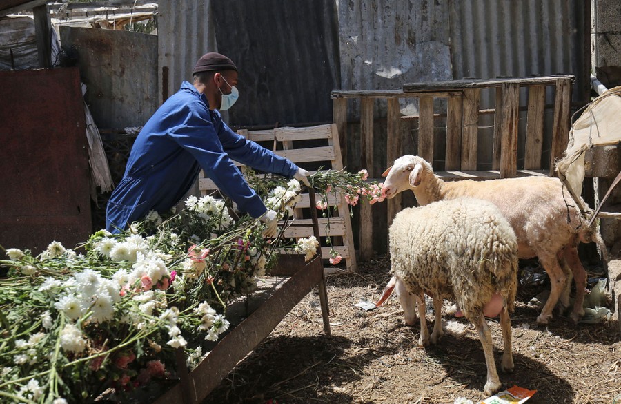 Read moreA Palestinian farmer wearing a mask feeds discarded chrysanthemum flowers to sheep at a farm in Rafah, in the southern Gaza Strip, on April 16, 2020. Palestinian farmers salvaged some of their unwanted flower crops to use as feed, after the market for flowers collapsed during the pandemic. #
