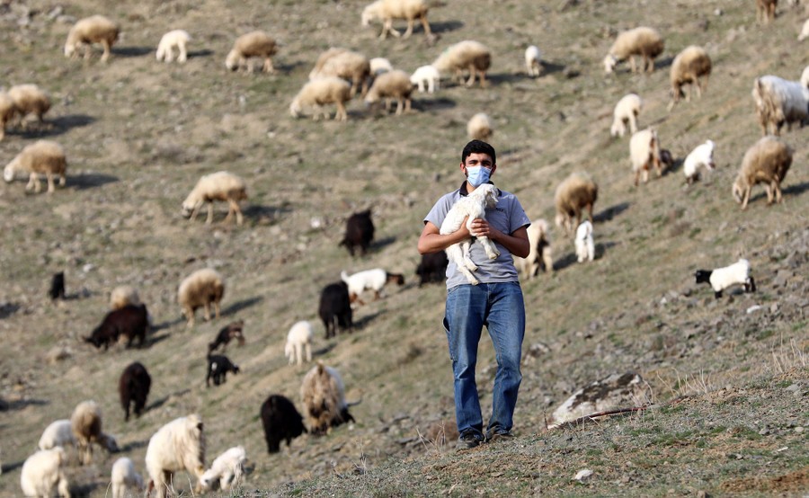 Read moreA shepherd wearing a protective mask carries a lamb as others graze in the fields around the village of Karatas, in the Çankaya district of Ankara, Turkey, on April 9, 2020. #