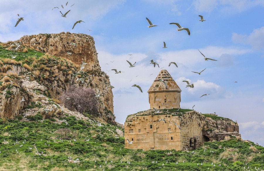 Read moreGulls fly around the ruins of Ktuts Monastery on Carpanak Island during the spring, northeast of Lake Van near the Citoren neighborhood in Van's Tusba district, on April 4, 2018. #