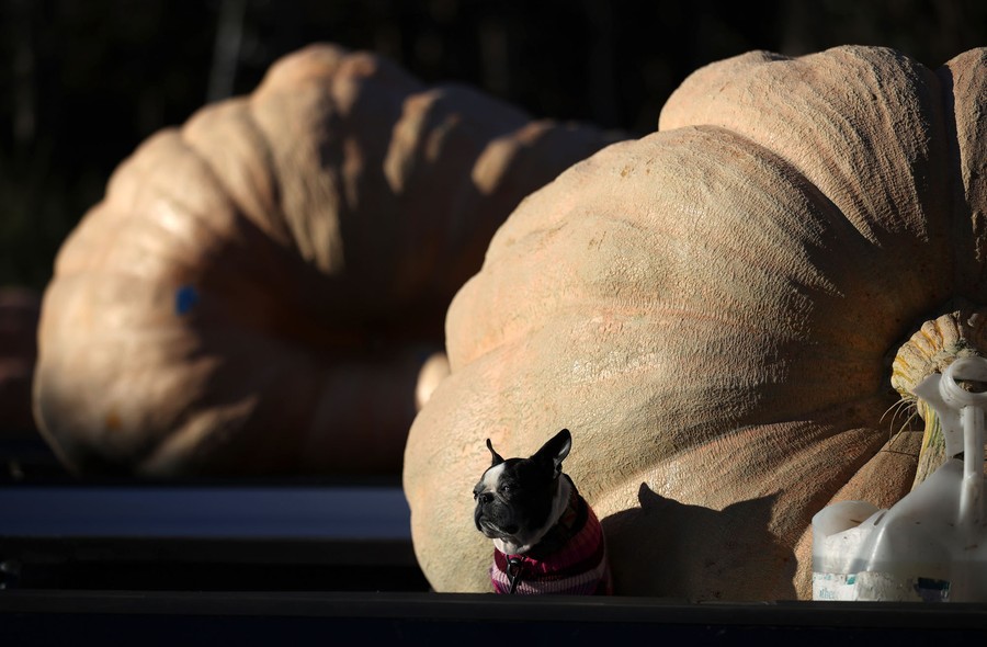 Read moreA dog sits in front of enormous pumpkins during the Safeway World Championship Pumpkin Weigh-Off in Half Moon Bay, California, on October 12, 2020. Travis Gienger, a farmer from Anoka, Minnesota, won the competition with his 2,350-pound pumpkin. Gienger won $7 per pound for a total of $16,450. #