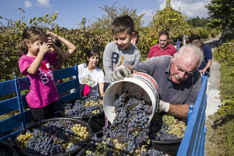 Read moreChildren help as freshly harvested grapes are loaded onto a Piaggio Ape van during a traditional grape harvest on October 11, 2020, in Catania, Italy. Three generations of a family from Trecastagni, a small village on the slopes of Mount Etna, harvest their grapes by hand before pressing them using ancient traditions. #