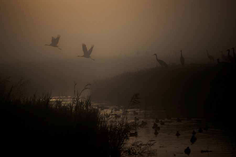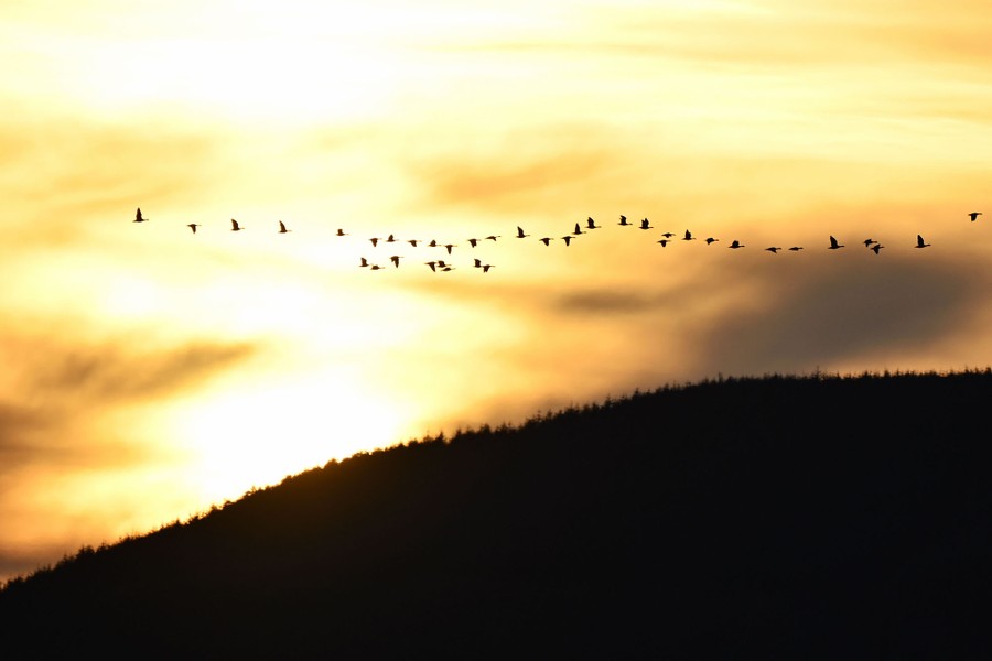 Read moreA flock of pink-footed geese fly in front of the setting sun as banks of mist and low clouds blanket the Lomond Hills and surrounding area, on November 7, 2020, in Glenrothes, Scotland. #