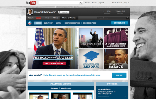 In the post-Kony era, the idea that digital networks can spread videos and ideas at mind-blowing levels should be a given. But the Kony folks didn't even make use of much of what YouTube has to offer. Check out Invisible Children's YouTube channel. There's not much to it than a video and some in-video calls to action. The opportunity exists to build what's basically a website within YouTube, one contextualized with social data and that viewers aren't eager to leave. That universe, in which narrative wins, is one that Obama wants to pull people into.