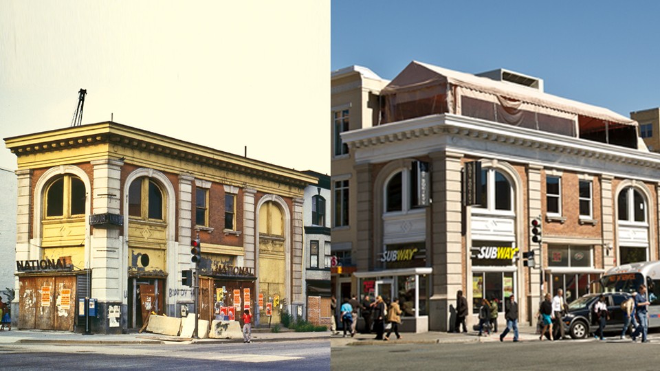 Then and now: U Street, once the black Broadway, in the 1980s and today.   (National Journal)