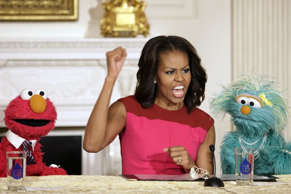 And yet some days it's hard not to look at her daily rounds and be reminded of the fundamental weirdness of the post she occupies. On Wednesday, Michelle Obama continued her long-standing efforts to encourage young Americans to get more exercise and eat more healthfully during an appearance with two Sesame Street characters, Elmo and Rosita. The occasion was the decision by the Sesame Workshop to allow produce companies to use the Sesame Street Muppets to market fruits and vegetables to children.