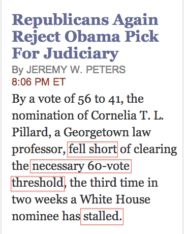 2) "Fell short" and "stalled" are intransitive verbs suggesting a weakness, failure, or insufficiency. In fact the nomination received a clear majority of 56 Senators, who as it happens probably represent about two-thirds of the population, but it was actively blocked rather than petering out on its own. To be fair, the headline uses the word "reject."