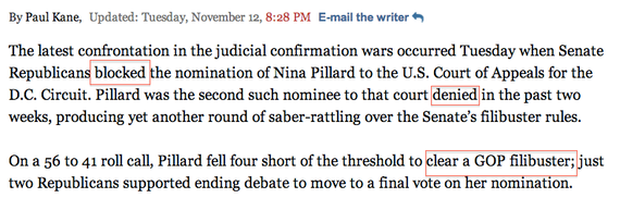 On point #1, we've got the plain word "filibuster." On point #2, we've got the transitive verbs "blocked" and "denied."