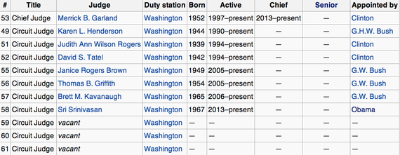 What's really going on here? Below you see the current lineup of the D.C. Circuit Court of Appeals, usually considered to be the most important appeals court not simply because of its jurisdiction over many federal regulatory cases but also because so many Supreme Court nominees come from there.