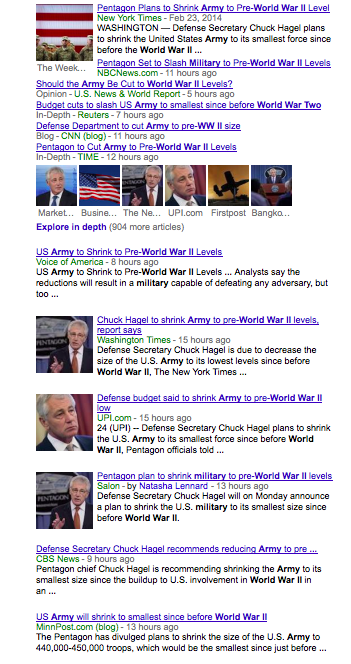 On Monday, large swaths of the news media reported on the Obama Administration's proposed military budget using the same misleading frame. As the New York Times stated in its headline, "Pentagon Plans to Shrink Army to Pre-World War II Level." Fox News chose the same emphasis. "The Army had already been preparing to shrink to 490,000 active-duty members from a wartime peak of 570,000," it stated, noting it will now be between 440,000 and 450,000. "That would make it the smallest since just before the U.S. entered World War II." Reuters' headline: "Budget cuts to slash U.S. Army to smallest since before World War Two."