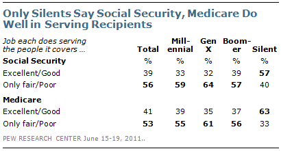 ... and the more you mistrust proposals for reform that might affect current recipients. In 2009, 43 percent of people in their twenties were open to reforms in entitlements that might touch those now receiving Social Security and Medicare; only 27 percent of people in the strongly conservative groups older than 65 would consider it.