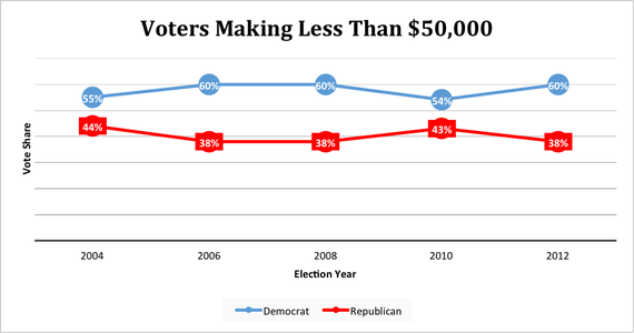 Republicans consistently win voters making $50,000 or more, approximately the U.S. median income. The margin doesn't vary too much: In 2012, Mitt Romney got 53 percent of this group's vote; in 2010, Republican House candidates got 55 percent. And Democrats consistently win voters making less than the median—but the margin varies widely. In fact, whether Democrats win these voters by a 10-point or a 20-point margin tells you who won every national election for the past decade.