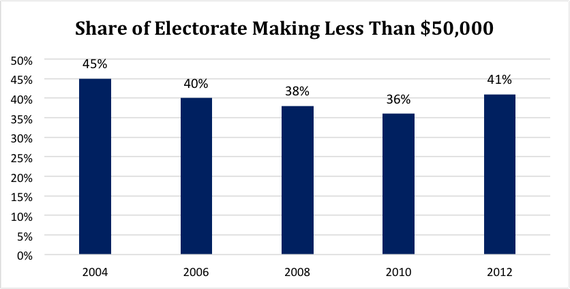 Now, as a union man, Podhorzer has an interest in encouraging politicians to cater to this demographic. But the data bears out his claim. In addition to working-class voters' Democratic margin, their turnout rate is also an important variable. Though they make up half of all earners, they consistently comprise less than half of the electorate, because the richer people are, the more likely they are to vote.