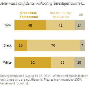 Whites also have much more confidence than blacks in the investigations into the shooting. More than three-quarters of blacks have little or no confidence in the investigations. St. Louis county prosecutors plan to begin presenting evidence about Michael Brown's shooting to a grand jury on Wednesday. The U.S. Justice Department is undertaking a parallel investigation.