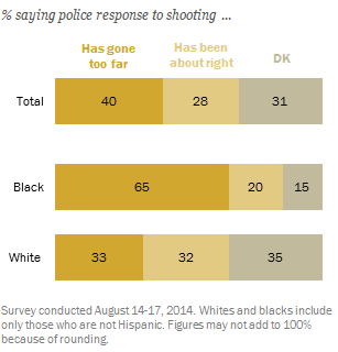 A racial division is also evident in views of the investigation of Brown's killing and the way police are handling the protests. A new national survey by the Pew Research Center finds 65 percent of blacks think the police response to the Ferguson protests has gone too far, compared to just 33 percent of whites.