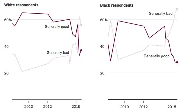 From the many instances of killings of and violence against black Americans by police, to the Charleston massacre, to the increasing awareness of disparate treatment of blacks by the criminal-justice system, the news is suddenly full of evidence of racial divisions, which are being covered nearly constantly and with new sophistication. One of the most interesting graphs The Times included is this one, showing the changing number of blacks and whites who think race relations are good: