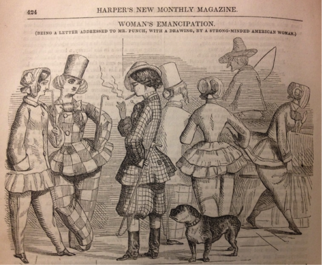 Griswold labeled the reformers who rejected Washington’s model of womanhood “shameless females” and “curious monsters.” He and others argued that if women engaged in politics they would become masculine. A separate visual vocabulary emerged to make the contrast clear. An 1851 engraving from Harper’s Monthly Magazine called “Woman’s Emancipation” lampooned reformers by depicting them in bloomers (rather than dresses) with overcoats disguising their female forms. Instead of caring for children, they leaned on canes and smoked pipes.
