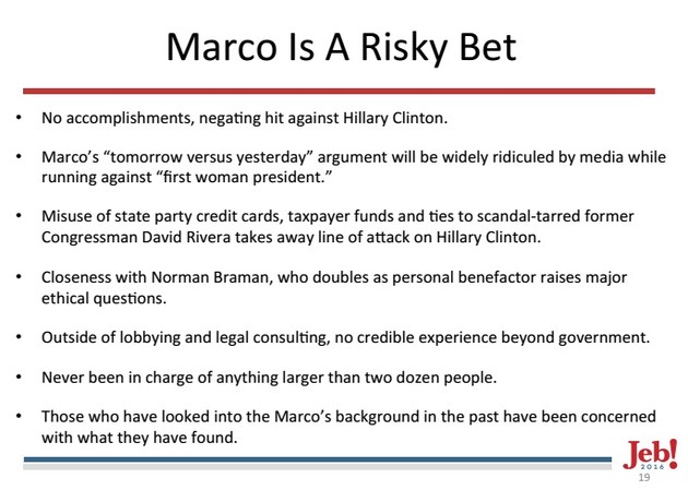 That was the end of that, at least for the evening. But the issue hasn’t gone away. On Thursday, David Catanese got his hands on the full version of a PowerPoint slideshow that Bush aides showed at their weekend retreat and regroup. One of the major takeaways from the retreat was that Bush would attack Rubio, his ascendant home-state rival, and the slideshow included this: