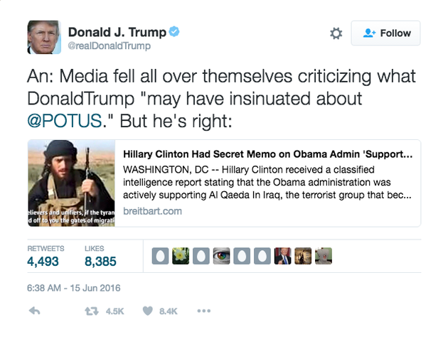 - This morning Trump more clearly said that the Obama’s administration had been deliberately assisting the enemy ISIS force. This was via his preferred communications of the Tweet he offered a Breitbart article, which he said showed “he’s right.”