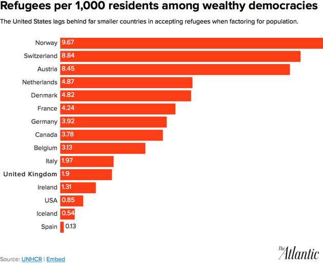 Then again, the continental United States is nearly twice as large in area as the European Union, and is far wealthier and more populous than any individual member state. Factoring in population, the United States drops to No. 75 in the world when it comes to sheltering refugees, behind virtually every other rich democracy. Even when controlling for GDP as well as population, the U.S. only hits No. 47.