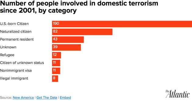The vast majority of domestic terror plots are planned and executed by U.S. citizens. Here’s a count of terror suspects arrested or killed since 2001, as tabulated by New America:
