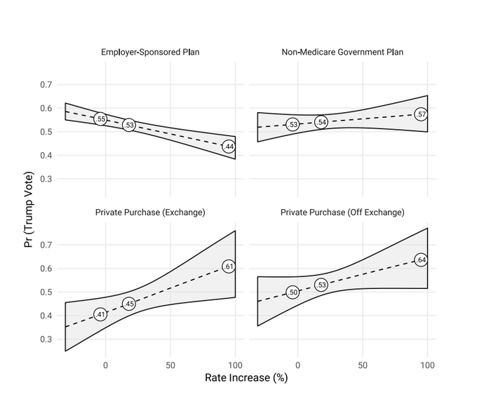 In places where premiums rose for private-exchange plans, even the people who gained heavily subsidized or free coverage under the new law became more likely to support Trump.